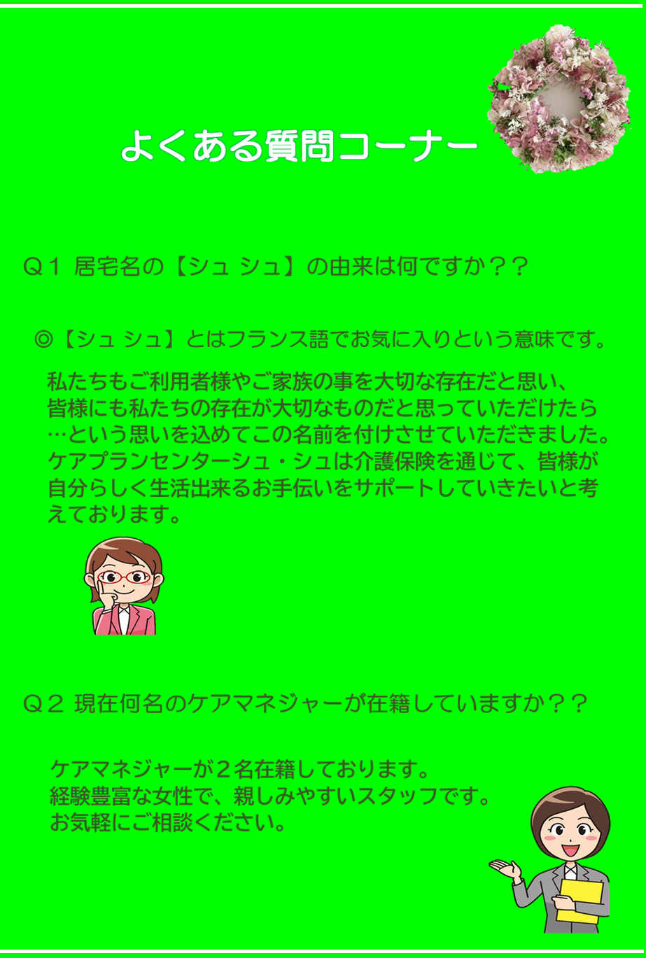 Q1【シュ・シュ】の由来、Q2現在ケアマネは何人在籍していますか、Q3どんな相談が多いですか